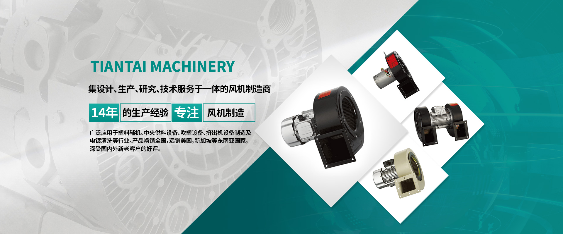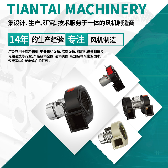 自成立以來,公司不斷引進新設備,新技術,擁有一批行業(yè)資深的工程師投入產品的開發(fā)與研究,對產品質量進行嚴格的監(jiān)控,天泰機械有限公司自主開發(fā)生產的“TIANZELU”牌風機廣泛應用于塑料輔機、中央供料設備、吹塑設備、擠出機設備制造及電鍍清洗等行業(yè)。產品銷往全國,遠銷美國,新加坡等東南亞國家,深受國內外新老客戶的好評。
